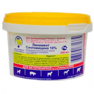 Линимент Синтомицина 10% предназначен для лечения гнойно-воспалительных заболеваний кожи и слизистых оболочек (гнойничковые поражения кожи, фурункулез, карбункулез, гнойные раны, ожоги, длительно незаживающие язвы, трещины кожи сосков вымени) как антисептическое, противовоспалительное и ранозаживляющее средство.